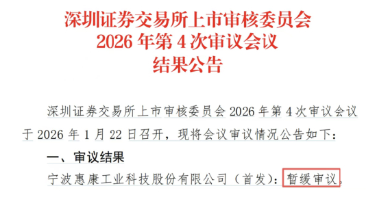 1月22日晚,深交所披露上市审核委员会2026年第4次审议会议结果,宁波惠康工业科技股份有限公司IPO被暂缓审议。这也是今年以来深交所首家、目前唯一一家在上会环节未能获得明确结论的拟上市企业。