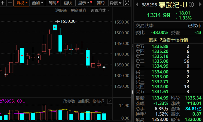从市场表现来看,自2026年1月13日至23日,跌幅居前的有寒武纪-U、农业银行、中国电信、兴业银行等,其中前2只成份股区间跌幅均超过10%。