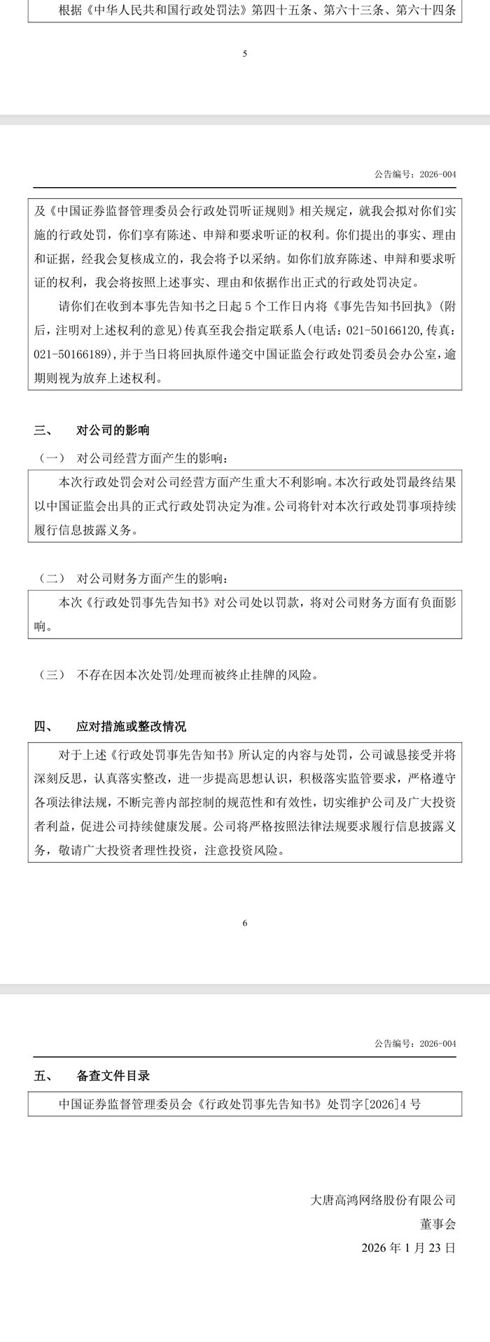 1、对大唐高鸿网络股份有限公司处以非法所募资金金额百分之十的罚款,即处以 1.25 亿元罚款。