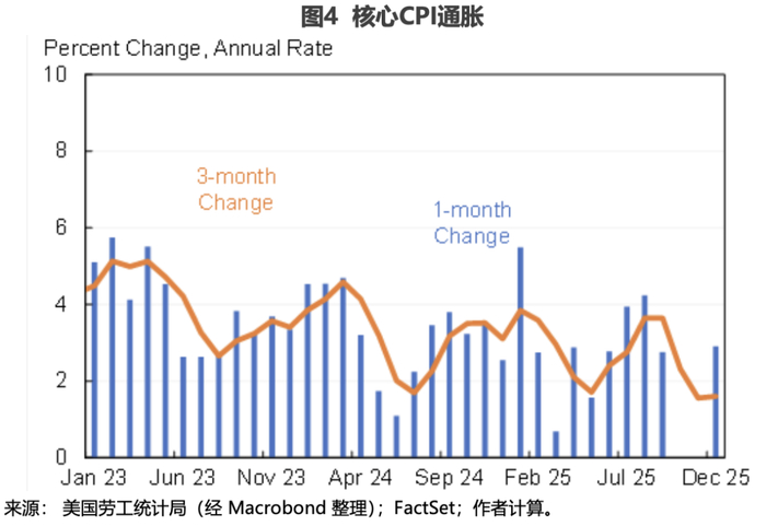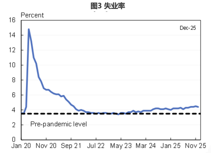 就业增长放缓的主要原因是劳动力供给减少。最大的供给减少来源是2021-2023年期间每年净迁入人数从数百万下降到2025年的0-50万。此外,老年工人和其他群体的劳动参与率增加可能已达上限。但需求侧也存在一定影响,正如图3所示,失业率持续上升。12月失业率为4.4%,比美联储估计的自然失业率(4.2%)高出0.2个百分点。