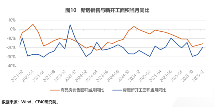 房地产方面,房地产企业的违约风险明显缓解,但核心指标(如新开工、新房销售)仍在下跌。2025年以来,房地产行业进行了更加有序的出清,而非恐慌下的行业挤兑。房企在权益市场的表现出现分化,优质房企股价表现突出。这些结构性变化是房地产行业止跌回稳的必要条件。目前,房地产投资与销售依然表现低迷,行业全面企稳回升还需房地产企业信用与居民购房需求的更快修复。