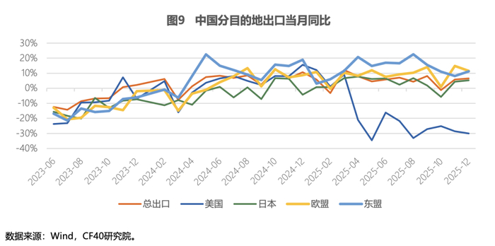 贸易方面,关税冲击对中国整体出口增速的影响相对有限,主要体现为中国对非美地区的出口大幅对冲了对美直接出口的下降。