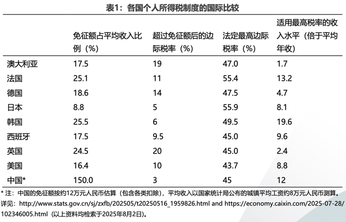 个税免征额的多次提高、广泛的专项扣除以及有限的征税覆盖面,显著侵蚀了个人所得税税基。目前个人所得税的实际免征水平约为每人每年12万元人民币,导致大多数劳动者无需缴纳个税,而在缴纳者中,超过60%仅适用3%的最低档边际税率。从国际比较看,中国的个税免征额相对于平均收入的比例异常之高,而具有实质调节意义的边际税率仅适用于极高收入群体(见表1)。