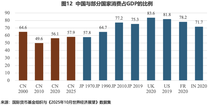 要理解中国的失衡,最好的方式是从消费不足和持续高投资的角度来分析。消费约占GDP的57%,而投资则保持在40%以上,这一水平对中国当前的收入阶段来说异常高。尽管自2010年以来中国消费占比有所增加,但与许多发达经济体及新兴经济体相比,这一差距仍然较大(见图12)。