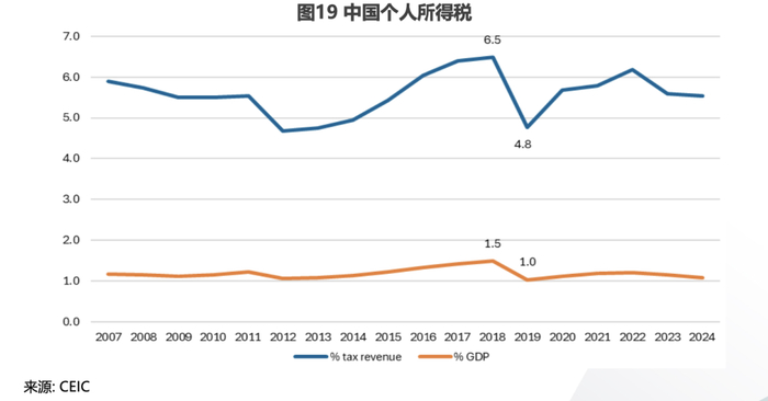 从增收角度看,个人所得税改革空间依然巨大。在各类主要税种中,个人所得税(PIT)是最突出的“例外”。2023年,中国个人所得税收入仅占GDP的1.1%(见图19),而经合组织(OECD)国家平均水平则超过GDP的8%(见图20)。这一结果并非源于征管能力不足,而主要是制度设计所致。