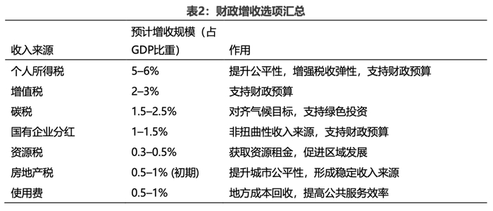即便在不提高法定税率的情况下,通过降低实际免征水平、简化扣除项目,并将劳动收入、经营收入和资本收入更一致地纳入累进税制框架,也可以在改善公平性的同时显著提升财政收入。因此,个人所得税改革是增强财政能力、推动更加平衡和包容性增长模式的最有力的政策工具之一(见表2)。
