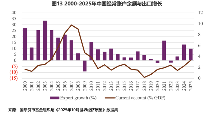 从外部来看,自2000年代末以来,中国的经常账户盈余显著收窄,但在绝对值上仍然庞大,这反映了中国经济规模的扩大。即便盈余占GDP的比例看似适度,这仍然会给其他国家带来调整压力(见图13)。