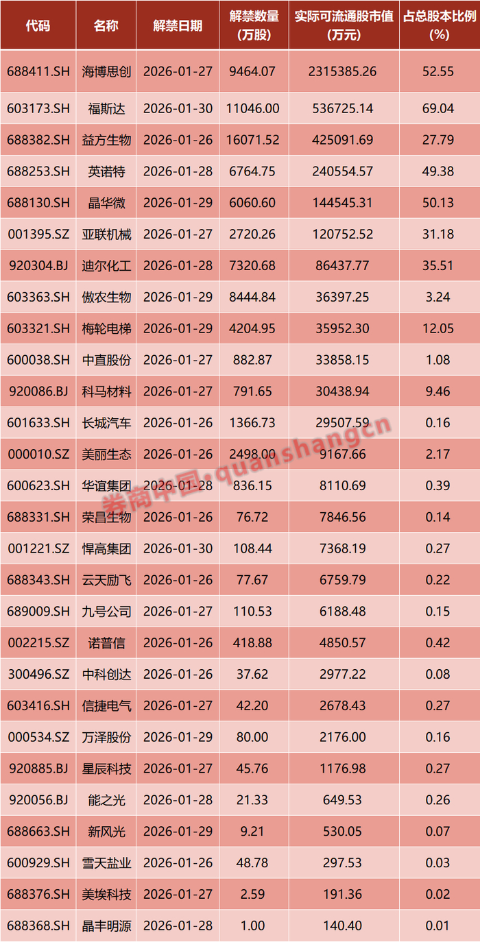 数据显示,本周(1月26日—1月30日)共有28家公司限售股陆续解禁,合计解禁7.96亿股,按最新收盘价计算,解禁总市值为409.68亿元。