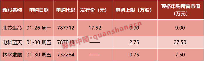 本周(1月26日—1月30日)有3只新股发行,周一:北芯生命;周五:电科蓝天、林平发展。