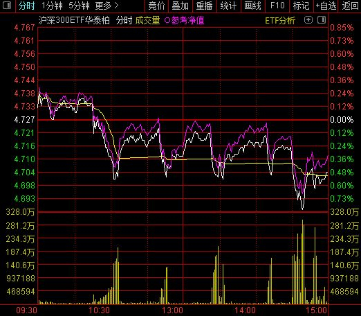 比如本周五,宽基ETF每次的短时放量下跌,不仅时间相比前几天更短,而且幅度也比前几天更小。下图是沪深300ETF华泰柏瑞(510300)周五的走势图,通过此图,大家能明白达哥说的这一点。