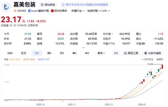 同日,嘉美包装(002969)公告,公司股票(证券简称:嘉美包装,证券代码:002969)自2025年12月17日至2026 年1月23日期间价格涨幅为408.11%,其间多次触及股票交易异常波动情形,公司股票短期内价格涨幅较大,已背离公司基本面,为维护投资者利益,公司将就股票交易波动情况进行停牌核查。 经公司向深圳证券交易所申请,公司股票自2026年1月26日(星期一)开市起停牌,预计停牌时间不超过5个交易日。公司提醒广大投资者注意二级市场交易风险。