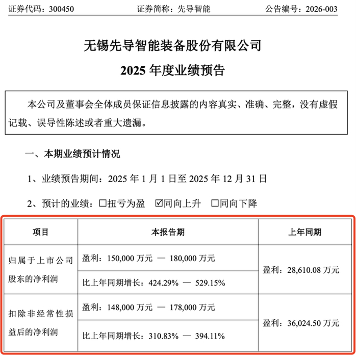 1月25日晚间,先导智能发布2025年度业绩预告,预计归属于上市公司股东的净利润为15亿元—18亿元,比上年同期增长424.29%—529.15%;预计扣非后净利润盈利14.8亿元—17.8亿元,同比增长310.83%—394.11%。