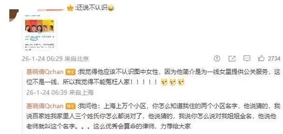 在网友的评论中,有人表示两位律师中的孙姓律师疑似与张雨绮认识。葛晓倩则回复道:“我觉得他应该不认识图中女性,因为他简介是为一线女星提供公关服务,这位不是一线,所以我觉得不能冤枉人家”,并连打了5个感叹号。