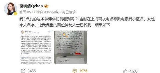 1月24日,葛晓倩在社交平台发文称,2024年10月,她接到匿名变声电话,对方精准掌握其家庭住址、家人信息,仅留下一句冰冷的“保重”便匆匆挂断,吓得她当即报警立案。