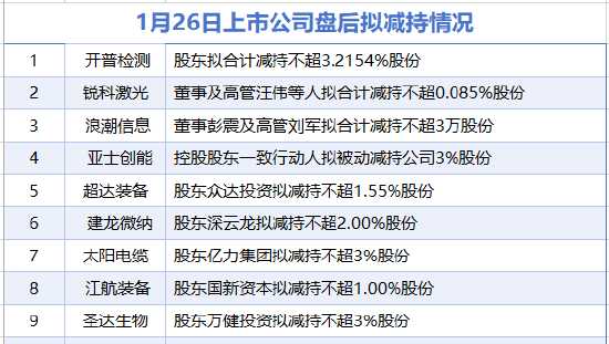 据统计,1月26日,盘后开拓药业披露增持情况。开普检测、锐科激光、浪潮信息、亚士创能、超达装备、建龙微纳、太阳电缆、江航装备、圣达生物等9家上市公司披露拟减持情况。