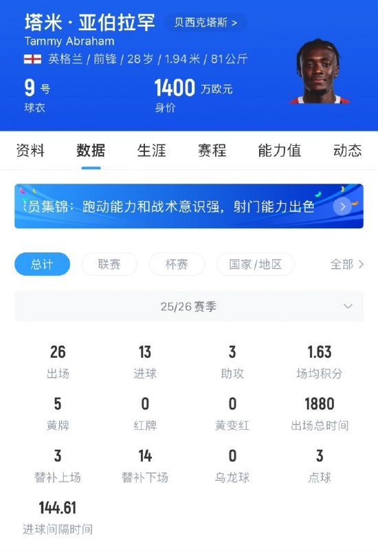 亚伯拉罕现年28岁,他此前被罗马外租至贝西克塔斯,协议中包含强制买断条款。他本赛季代表贝西克塔斯出战26场13球3助,现身价1400万欧。