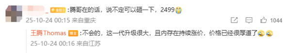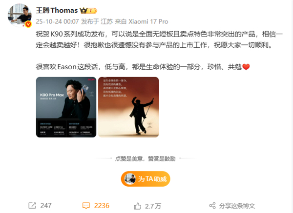 例如在REDMI K90系列发布时,王腾曾发文祝贺K90系列成功发布,并称该代产品升级幅度较大,在内存持续涨价背景下,价格已经很厚道。