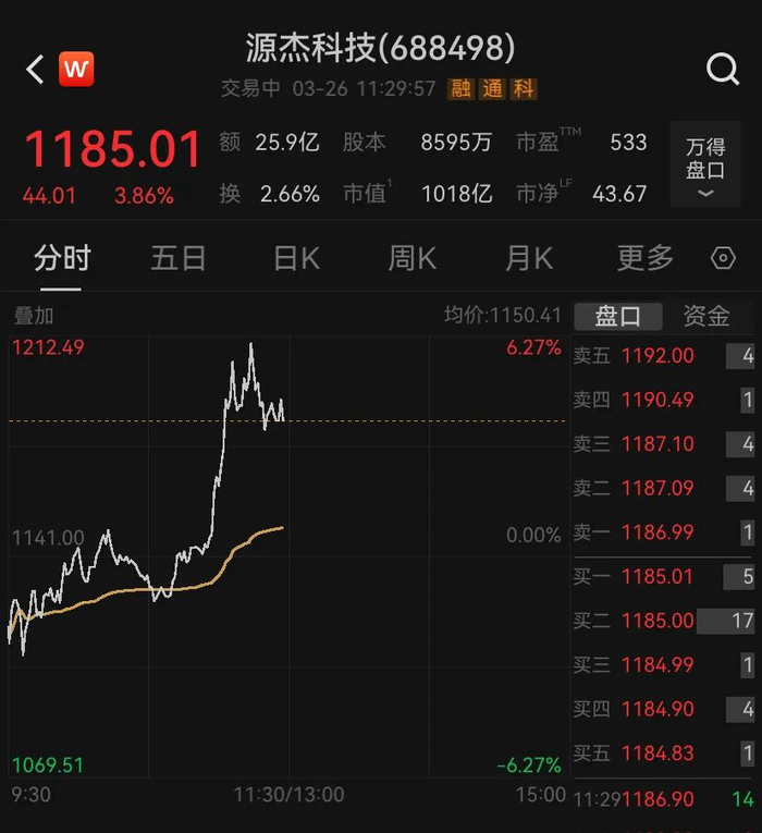 3月26日早盘,CPO概念再度活跃。人气龙头股源杰科技盘中涨超5%,股价最高触及1212.49元,续创历史新高,总市值突破1000亿元大关。截至午间收盘,该股涨幅收敛至3.86%,年初以来累计涨幅约85%。