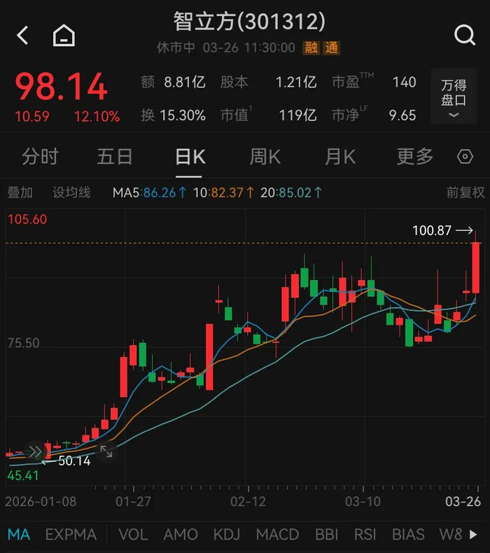 智立方涨超12%,截至午间收盘报98.14元/股,盘中股价触及100.87元的历史新高。此外,铭普光磁涨停,收获6天3板,罗博特科、天孚通信、仕佳光子、长光华芯等多只个股跟涨。