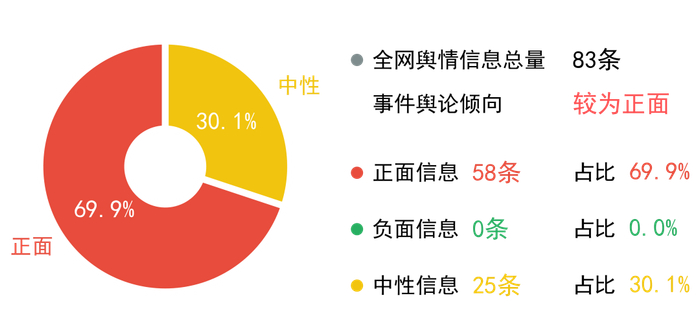 截止3月26日,此事件匹配的到全网舆情信息总量为83条,正面信息58条,占比69.9%,负面信息0条,占比0%,中性信息25条,占比30.1%事件舆论呈现出较为正面的倾向