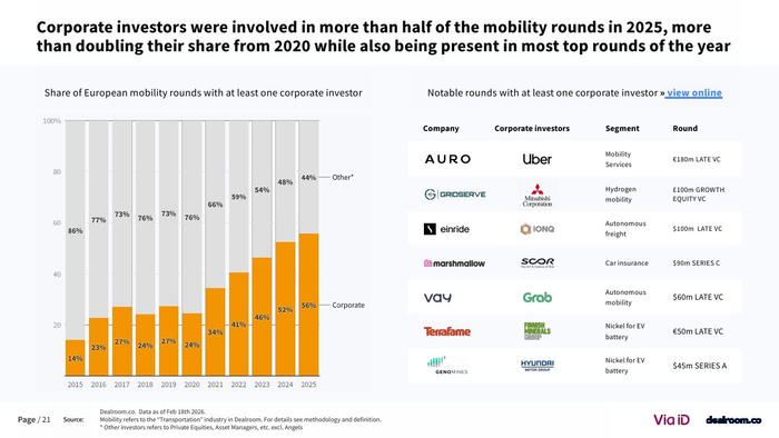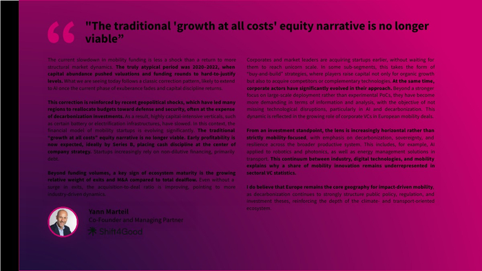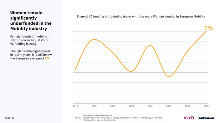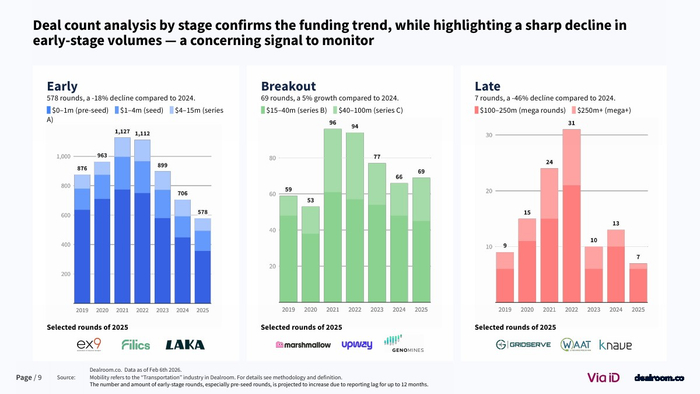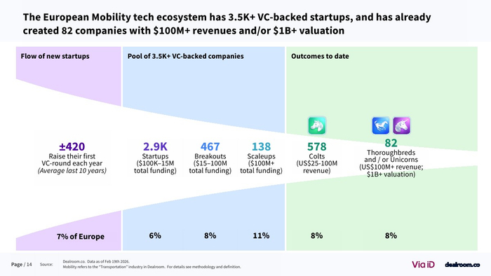 从生态层面看,欧洲已形成超过3500家风投支持的移动出行企业,其中82家成长为独角兽或高收入企业 。同时,该领域在气候科技中的占比降至约20%,为十年最低,但仍是第二大子赛道。这说明其战略重要性未变,但资本优先级有所调整。