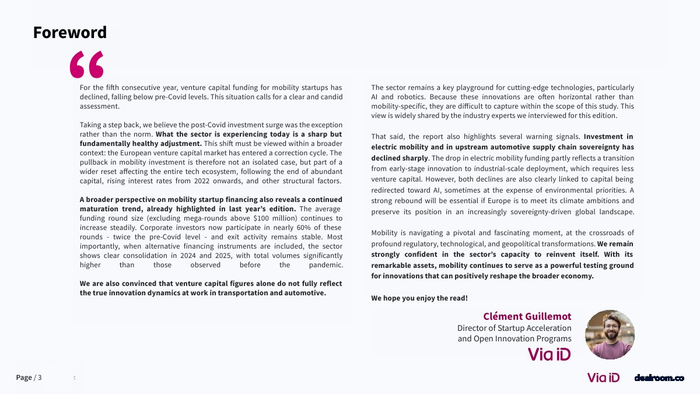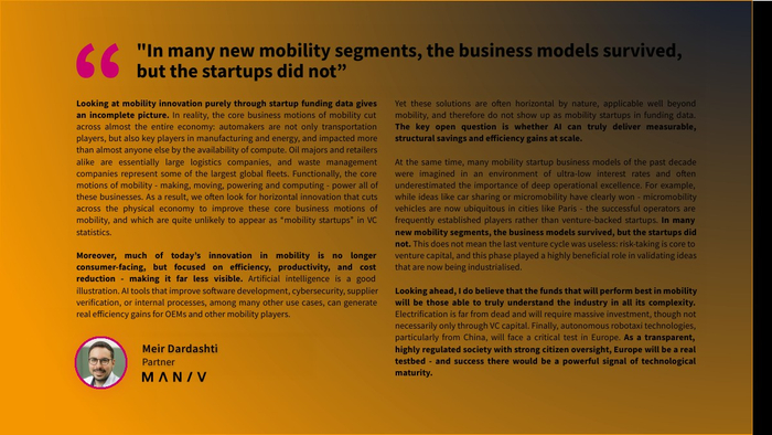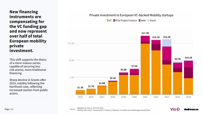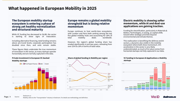 值得注意的是,电动化赛道明显降温。电池与充电基础设施融资占比从2023年的60%降至约20%,整体电动出行融资较2021-2023年平均水平下降39% 。与此同时,人工智能与军民两用技术成为新热点,其中相关融资五年增长达4倍。这反映出资本在地缘政治与技术周期驱动下,正从“绿色优先”转向“效率与安全优先”。