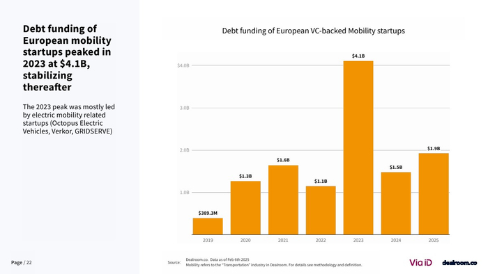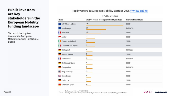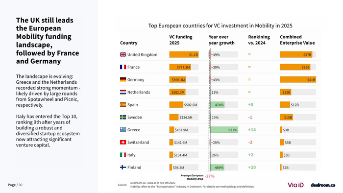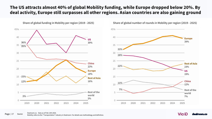 在全球格局中,欧洲竞争力出现边际下滑。其在全球移动出行融资中的占比已从25%以上降至18%,而美国吸引近40%的资金 。尽管如此,欧洲在交易数量上仍保持领先,伦敦与巴黎贡献全球39%的交易量,显示其生态活跃度依然稳固。
