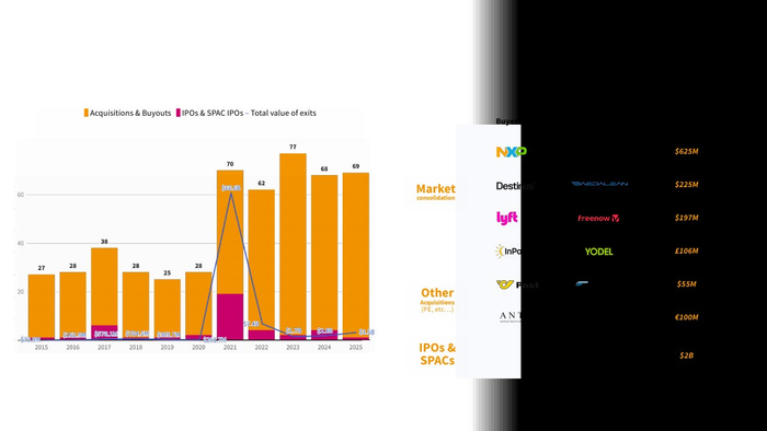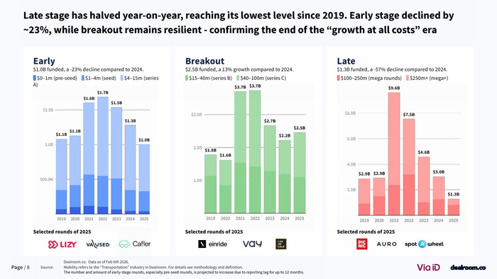 2025年欧洲移动出行行业正经历显著的资本收缩与结构重塑。数据显示,风险投资总额降至48亿美元,同比下降27%,并已连续五年下滑,回落至2018年以来最低水平 。与此同时,欧洲整体风投市场却实现18%的增长,显示出资金正向其他赛道转移。这一变化本质上是疫情后资本过剩的修正,标志着行业从非理性扩张进入理性配置阶段。