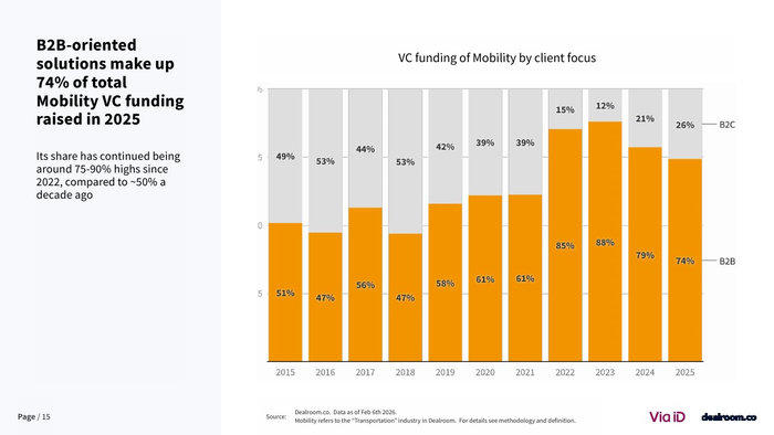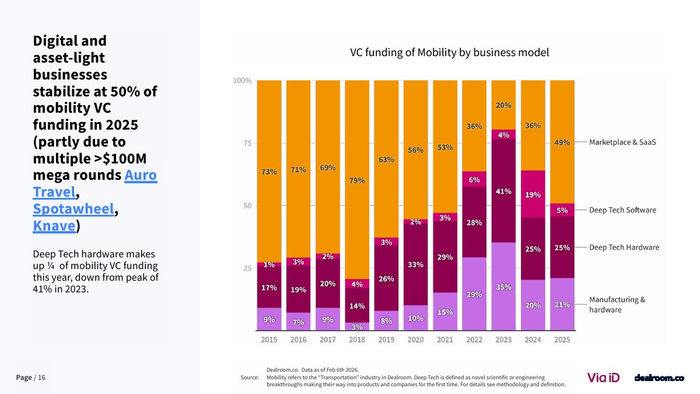 从行业结构看,B2B模式占据主导地位。2025年面向企业的解决方案占融资总额的74%,较十年前约50%的水平显著提升 。同时,轻资产与数字化模式占比稳定在50%,而深科技硬件占比从2023年的41%下降至25%。这表明资本更青睐可扩展、回报周期更短的商业模式,而对重资产制造环节趋于谨慎。