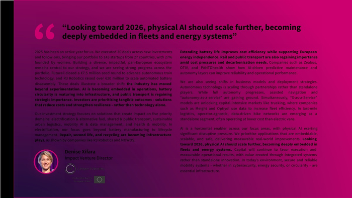 整体来看,欧洲移动出行正从“资本驱动”转向“效率驱动”。未来趋势将呈现三大方向:一是AI尤其是“物理AI”将深度嵌入交通与能源系统;二是融资结构持续向债务与产业资本倾斜;三是行业将加速整合,盈利能力与现金流成为核心指标。在资本约束与技术跃迁并存的背景下,具备产业协同与运营能力的企业将成为新一轮周期的主导者。