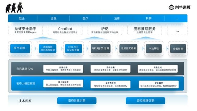 在产品布局上,荆华密算面向数据高敏感行业提供高密级的本地化私域部署方案,构建覆盖“输入-推理-输出”全流程的密态计算防护体系;面向开发者与C端用户,推出密态推理平台和“龙虾安全卫士”,支持跨平台、多终端即插即用;同时针对高价值私域数据领域,基于密态训练引擎,实现数据真正以密文形式的租赁式出售。首批商业落地场景覆盖政企、金融、医疗、法律、科研等行业。