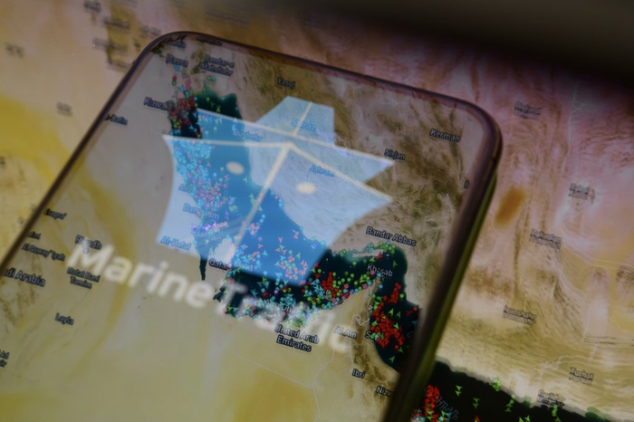 当地时间2026年3月27日,法国克雷泰伊,一部手机屏幕上显示着MarineTraffic应用程序的标志。软件应用投射出波斯湾和霍尔木兹海峡的海上交通地图。视觉中国 图