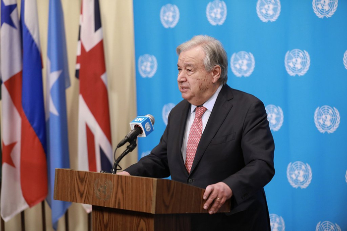 当地时间2026年3月25日,联合国秘书长古特雷斯在纽约联合国总部举行的记者会上就中东局势对媒体发表讲话,呼吁美国和以色列结束对伊朗的战争,同时敦促伊朗停止攻击邻国。 中新社记者 廖攀 摄