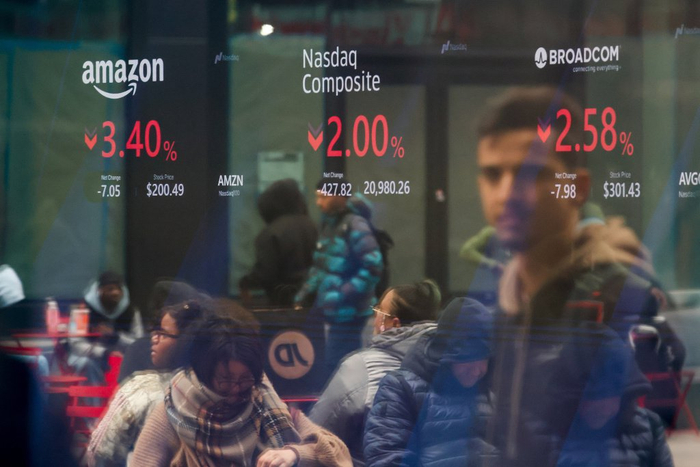 当地时间2026年3月27日,美国纽约,纳斯达克市场网站的市场信息画面。华尔街交易员在周末前推动股市走低,原因是市场担忧伊朗的长期战争将使油价居高不下,同时加剧通胀并导致经济增长放缓。视觉中国 图