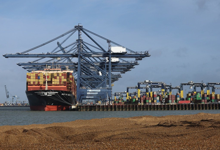 当地时间2026年3月11日,英国费利克斯托,集装箱船在费利克斯托港卸货。自2026年2月28日美以袭击伊朗紧张局势升级以来,霍尔木兹海峡70%的海上航运量下降。据国际粮食政策研究所(IFPRI)称,霍尔木兹海峡长期关闭可能影响化肥和粮食生产成本,全球30%的化肥通过该海峡运输。视觉中国 图