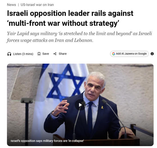 不过,在以色列国内,反战的声浪同样在提升,反对党“拥有未来”党领导人、前总理拉皮德批评内塔尼亚胡“缺乏战略”,“多线作战”则让以军疲惫不堪。