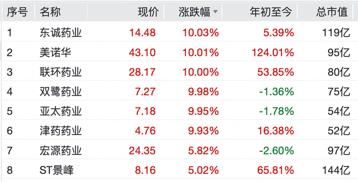 个股方面,美诺华走出7天6板,亚太药业、东诚药业、联环药业、津药药业、双鹭药业均录得10cm涨停;英科医疗、奥美医疗均涨超6%,美迪西、浙江医药、普洛药业等纷纷上涨。