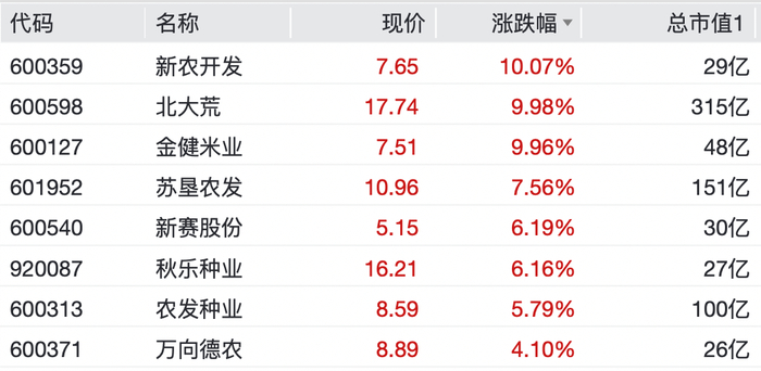 个股方面,平潭发展、新农开发、北大荒、金健米业均录得10cm涨停;苏垦农发、秋乐种业、新赛股份等纷纷大涨。