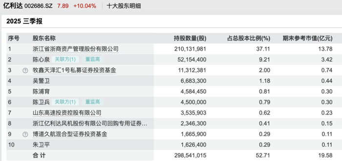截至2025年三季度末,浙商资产为亿利达第一大股东,持股数量为2.1亿股,持股占比为37.11%,期末持股市值为13.78亿元。