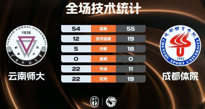 加时赛成都体院没有再犯错,王洋命中三分帮助成都体院抢占先机,他们送上一波7-0的攻势直接拉开比分奠定胜局,最后时刻法亚娇命中三分追至5分为时已晚。最终,成都体育学院91-85力克云南师范大学杀入八强赛。