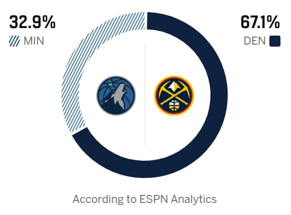今天,ESPN预测本场胜率,森林狼32.9%,掘金67.1%。