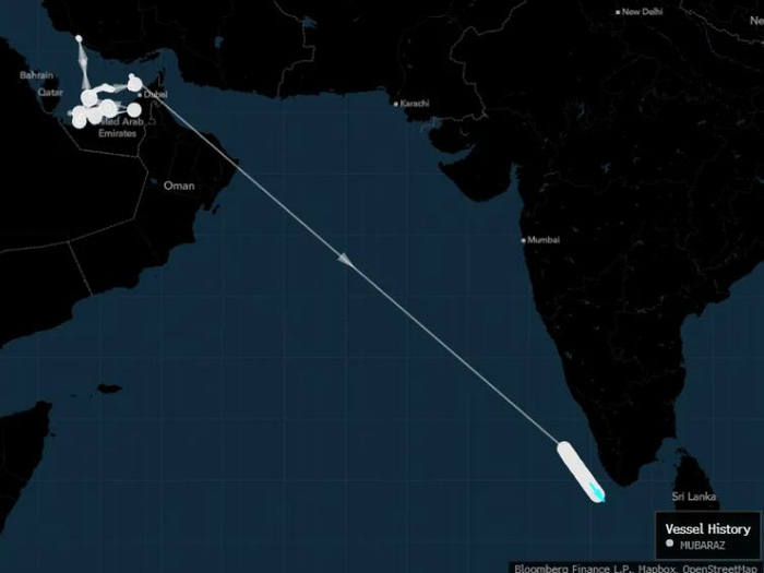 船舶追踪数据显示,船只“Mubaraz”于三月初在阿联酋的阿布扎比国家石油公司达斯岛设施完成装载——目前正途经印度南端。该油轮曾在波斯湾内闲置多时,自3月31日左右起船舶定位信号中断,直至4月27日才在印度西侧海域重新显示航行轨迹。