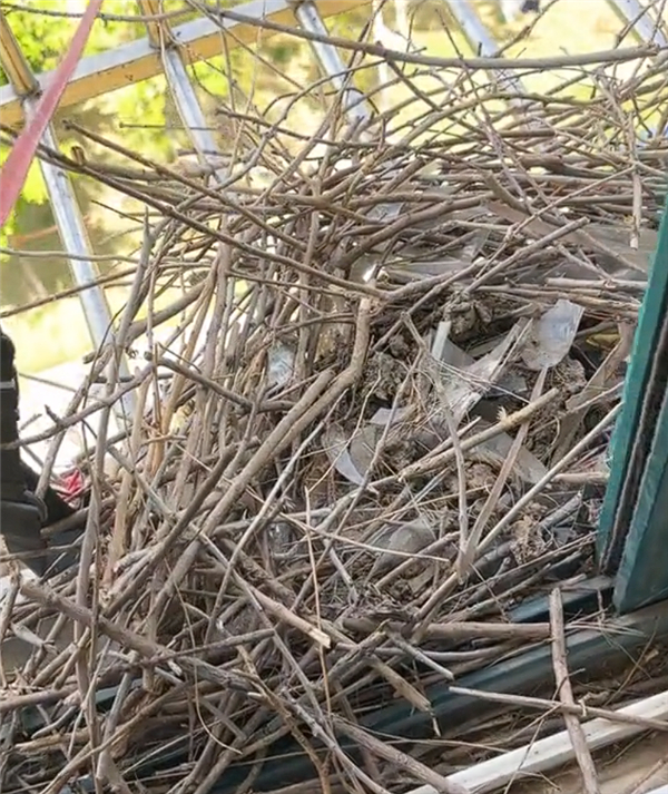 视频中可见,窗户缝隙和窗台上堆满了长短不一的树枝、沾满泥土的枯草、破碎的玻璃片和扭曲的金属丝,甚至还有被咬断的太阳能管残段,清理难度极大。