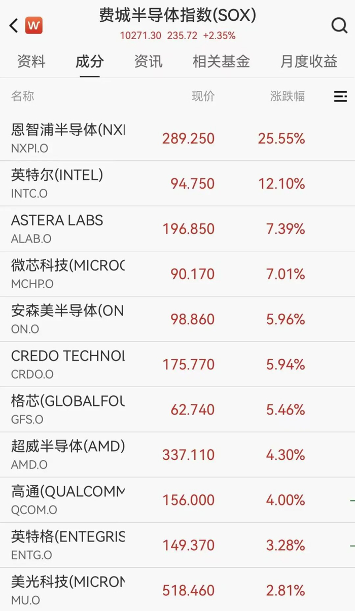 芯片股普遍上涨,费城半导体指数涨2.35%,恩智浦半导体涨超25%,英特尔涨超12%创新高,市值突破4700亿美元,微芯科技涨超7%,超威半导体涨超4%。存储芯片走势强劲,希捷科技涨超11%,闪迪涨超6%,西部数据涨超5%,美光科技涨近3%。高通因第二季财报营收超预期,盘后涨幅一度大涨至16%。